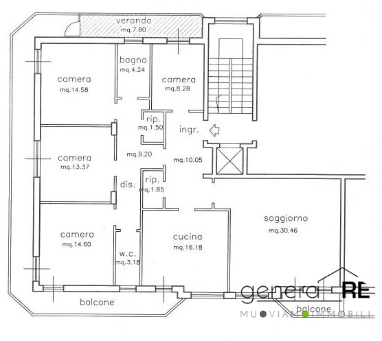 L'immobile, caratterizzato da ampie metrature e da una disposizione funzionale degli ambienti, è così composto: accogliente sala soggiorno, ampia cucina abitabile, tre camere da letto, uno studio, due bagni, due comodi ripostigli, balcone perimetrale e veranda chiusa.