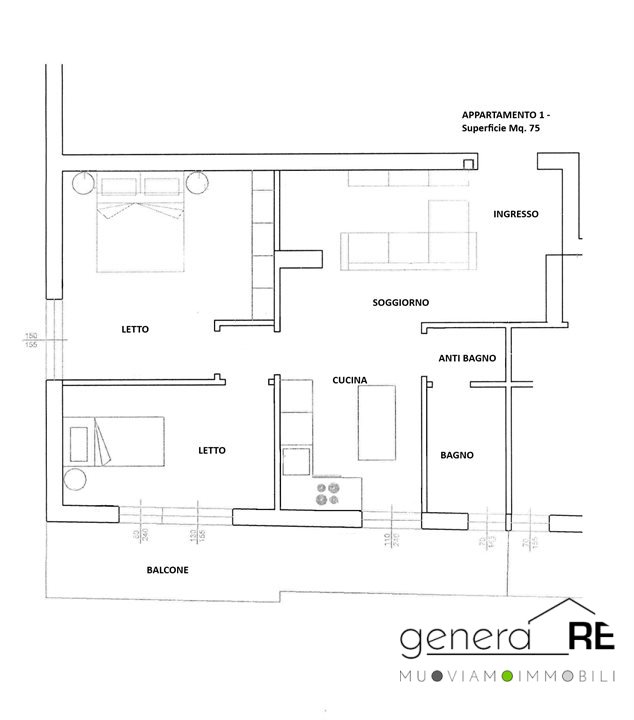 L'appartamento è composto da un ingresso soggiorno con cucina a vista, bagno e antibagno, due camere da letto e un ampio balcone.