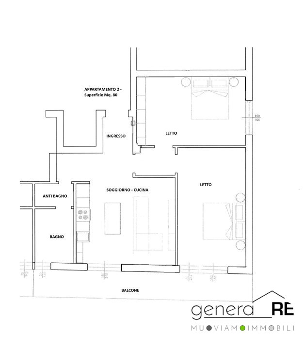 L'appartamento è composto da un ampio ingresso, soggiorno-pranzo con cucina a vista, bagno e antibagno, disimpegno e due camere da letto. Completa la proprietà un ampio balcone.